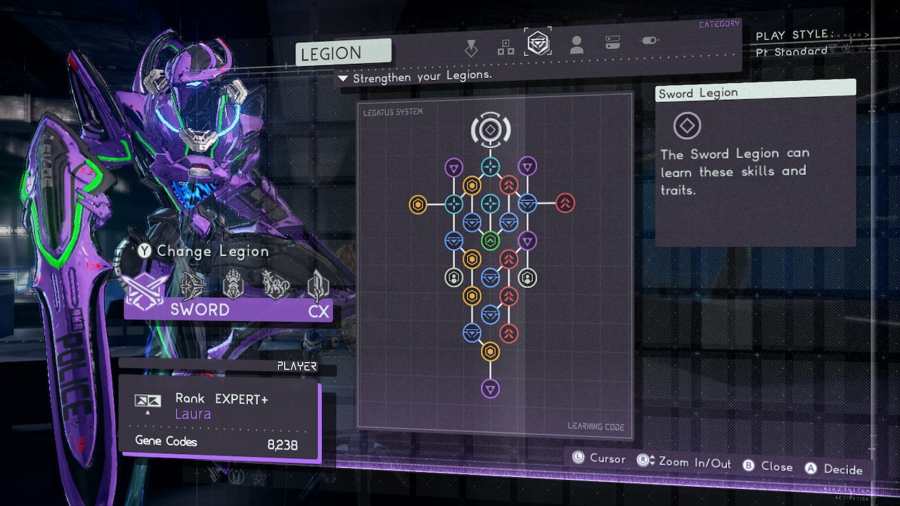 In terms of the combat, Astral Chain plays pretty differently to most other Character Action games. Throughout the game, you will have access to five different legions, each of which have their own unique abilities and attacks. A few examples include the Beast Legion, which can be used to automatically dodge attacks in exchange for meter, the Sword Legion, which can parry attacks as they are incoming, the Axe, which can generate defensive shields, and the Arrow, which unsurprisingly gives you ranged options as a player.