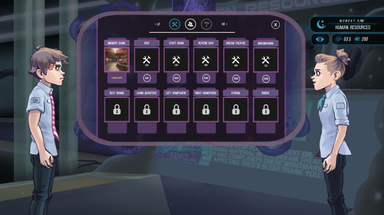 I played Headspun on Nintendo Switch, and I can’t attest for other platforms, but the retail version which has been out for around a week is unplayably buggy. I was initially willing to push through bugs that were annoyances but not progression halting, such as menus requiring me to watch a painfully slow text crawl before I could pick an option where they had previously allowed me to skip straight to the choice, or store menus requiring me to exit the room and re enter it between purchases rather than just picking multiple purchases in a row. These sorts of bugs were nuisances, but not impossible to push through. The real issue came when I encountered an issue where the control room of the brain wouldn’t let me switch tabs at all, preventing me from accessing the activities which progress the game. Quitting and reloading the game didn’t fix the issue, and the game’s single save system meant I could not revert to an earlier state to get around it. Around two hours of plodding through the game, I could not progress, and its slow pace meant I was not willing to start over from scratch.