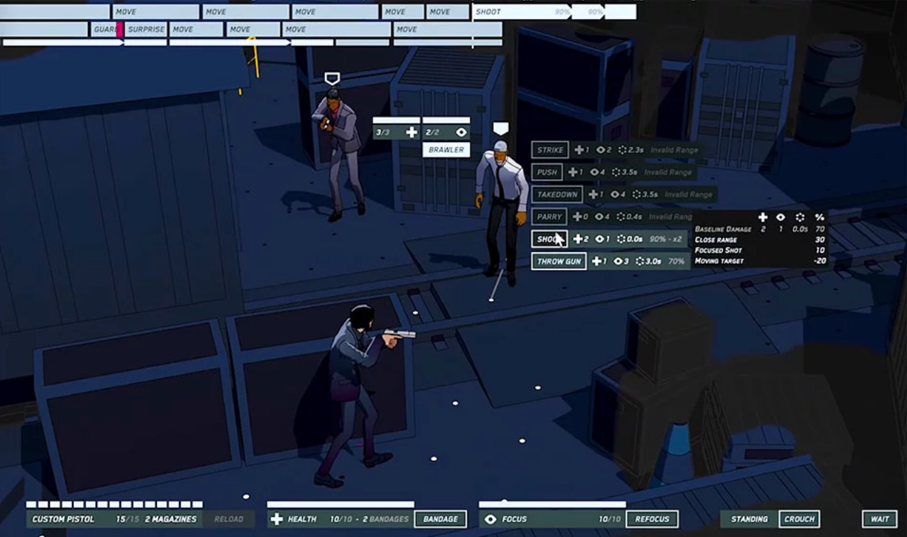 This is initially a bit of an information overload, particularly because this demo was missing the tutorial which will apparently exist in the full game, but I can see what it’s going for. By giving the player far more information and control over success or failure than they would really have in this situation, it makes it easier to pull off the ludicrous combat moves that you see in the films. If you can see that an enemy can shoot you before you have time to shoot them, you can check their percentage odds of hitting you. If those odds are high, you can check what you do have time for, either to 100% get to safety or drop those damage odds. You at all times have all the information you need to escape situations where you are impossibly cornered, and there is something really cool about that. It took a little getting into the rhythm of the game, but by the final couple of levels of the demo I felt like I* had the hang of it.
