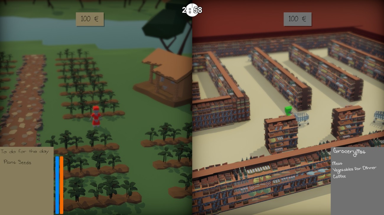Harm to Table is a really impressive split screen game, where two players play through minigames on differing sides of the food production pipeline. One player works as a farmer, trying to manage a profitable and sustainable farm in a developing nation, while another plays a customer in a big supermarket, rushing around chaotically trying to buy items from a shopping list in a rush. The choices each player makes impact the other player, from overly high demand for certain farmed goods, to low stock availability of other goods, as the two halves of the ecosystem try to co-exist.