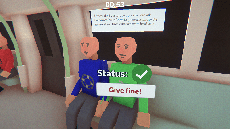 You play as a train ticket conductor in a world where attempts have been made to remove inequality and prejudice as factors of life. In a world where universal basic income has solved issues of extreme poverty, public transport has replaced cars to an extent that it has helped solve our climate crisis, and discrimination based on appearance is no longer an issue, your job is simply to check for fare dodgers on a train.