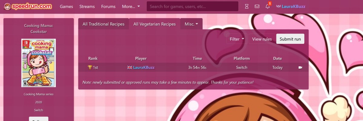 Run verified here: https://www.speedrun.com/cooking_mama_cookstar#All_Vegetarian_Recipes