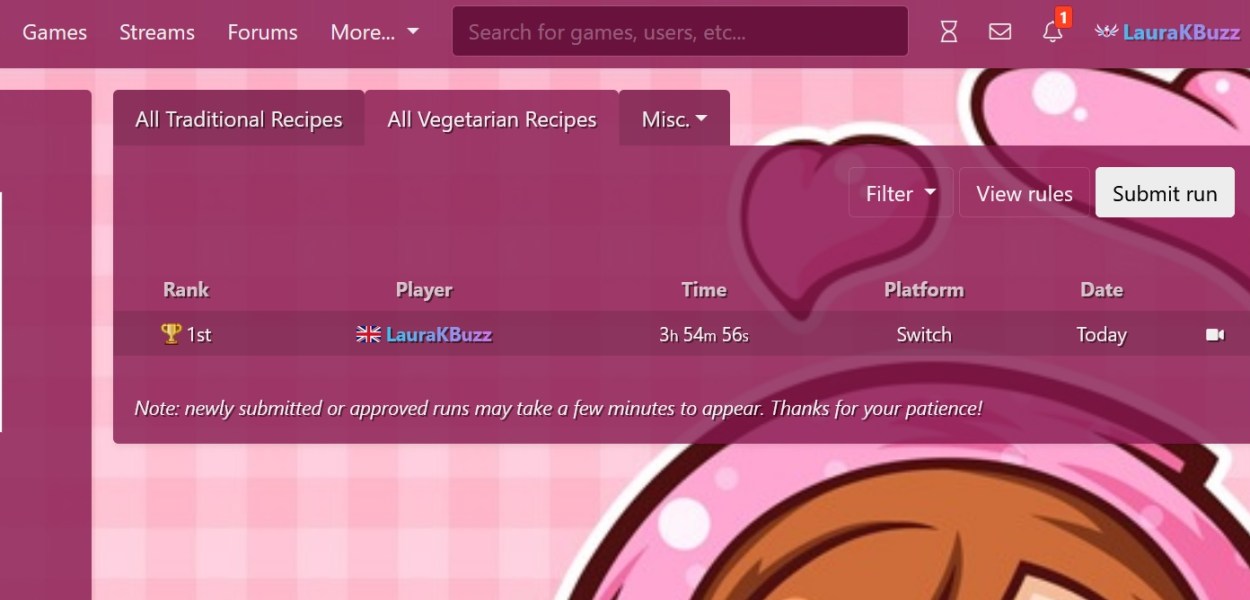 Well, I just broke a world record in a bad game nobody plays. YAY! Run verified here: https://www.speedrun.com/cooking_mama_cookstar#All_Vegetarian_Recipes