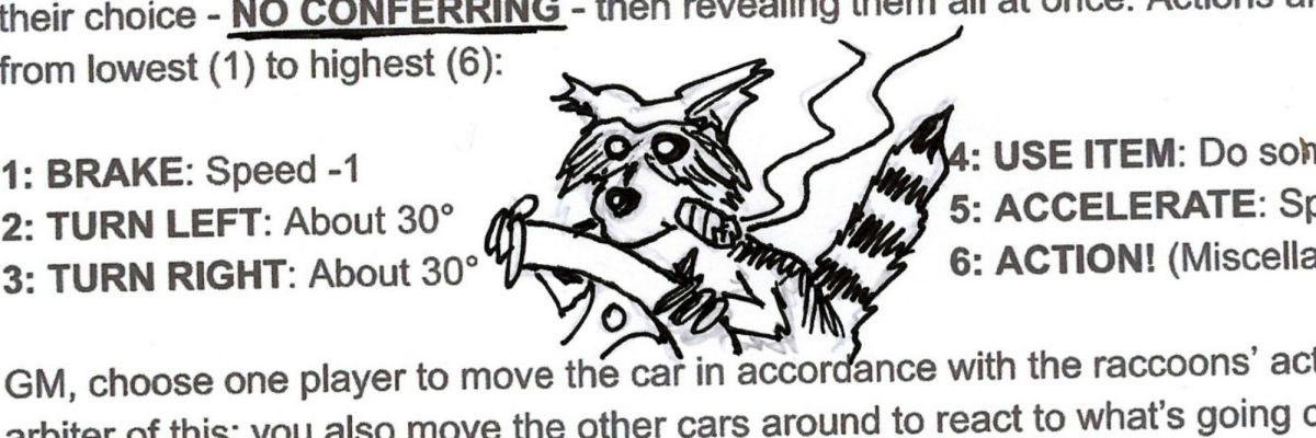 In this Crash Pandas ( https://gshowitt.itch.io/crash-pandas ) one shot, Zenala tries to defeat the witch that turned them into a Raccoon, RyanGosling (One word) races…. For HER, and Mister Crinkles chases adrenaline fueled adventure.